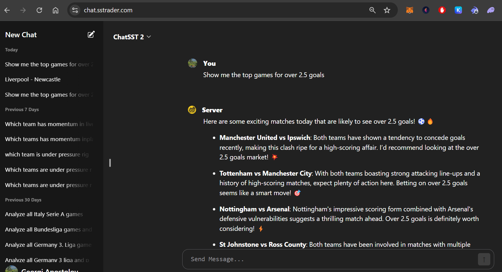 For instance, if a player asks, “**Give me all predictions for \[Home Team] vs. \[Away Team]**” or “**Show me the best matches over 2.5 goals.**”, the [**ChatSST** ](https://chat.sstrader.com/)chatbot can immediately respond with the latest score or step-by-step guidance. This kind of **real-time support** keeps players in the flow of the action. It’s akin to having a knowledgeable friend or a **virtual assistant** by your side 24/7.&#x20;