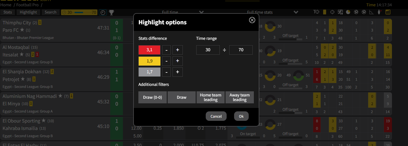 **Даваме пример**: Отбор  El Obour Sporting има общо 8 удара, а отбор Kahraba Ismailia – 0. Разликата в ударите е над 3.1  пъти и затова този показател е оцветен в червено. Стойностите, които виждаш, са зададени от нас, но ти лесно можеш да ги промениш според своите предпочитания.