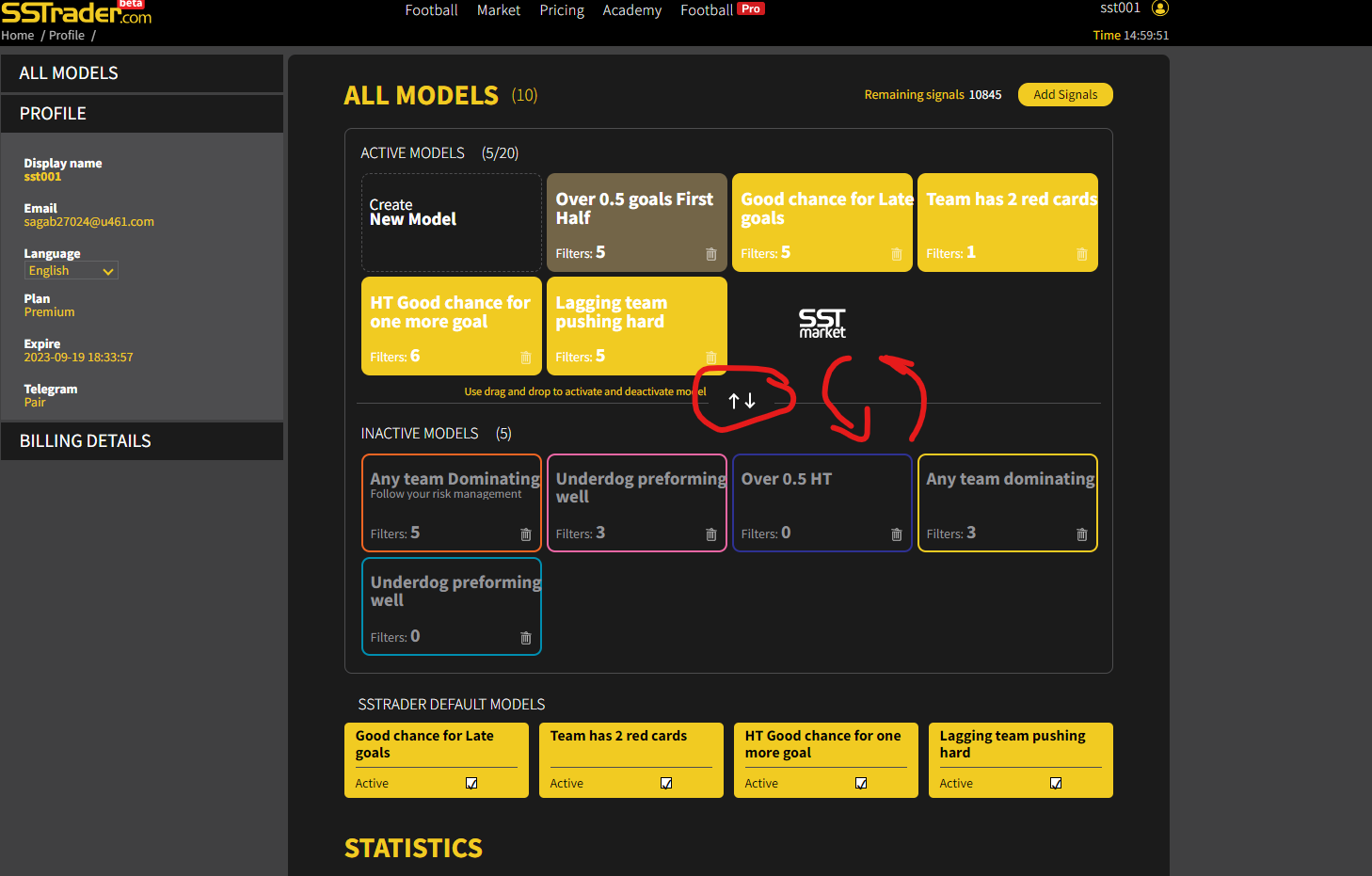 В същия цвят ще бъдат маркирани и срещите, които съвпадат с критериите на твоя новосъздаден модел в **SSTrader Premium Console**. След като одобриш промените, страницата те отвежда до Настройките на модела, където се намират всички детайли и фундаменти. [**SSTrader.com**  ](https://sstrader.com/)