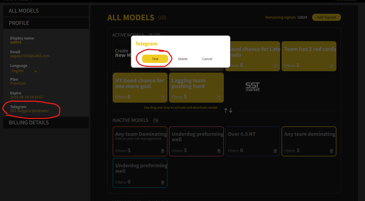 5. Para verificar que todo esté configurado correctamente, ve a "Mi perfil" en SSTrader y haz clic en tu Telegram ya conectado. Esto enviará un mensaje de prueba a tu teléfono. Si recibes el mensaje, tu Telegram está conectado exitosamente a SSTrader.
