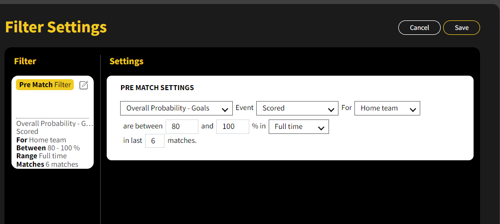 El filtro Prematch le permite monitorizar métricas Prematch, o estadísticas que están disponibles antes del inicio de un partido. Puede utilizar este filtro en combinación con las estadísticas en vivo para crear modelos poderosos.
