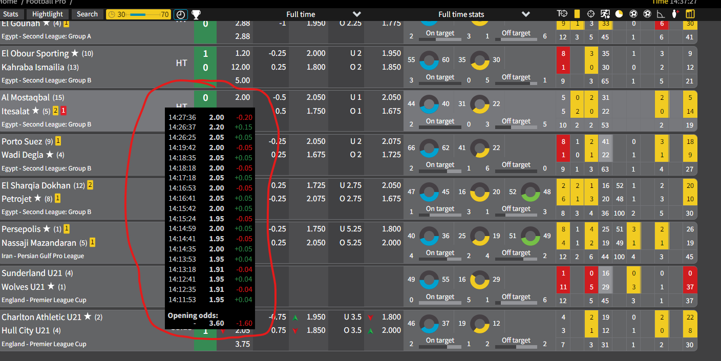 Además, puedes ver las cuotas actuales para el partido en tiempo real para mercados como 1x2, handicap asiático y debajo/sobre un cierto número de goles. Al colocar el cursor del ratón en la cuota, puedes rastrear el movimiento del precio durante el partido, lo que te ayuda a evaluar si las cuotas tienen valor en ese momento. En general, estas funciones están diseñadas para facilitar que mantengas al día las últimas cuotas y tomes decisiones de comercio informadas.