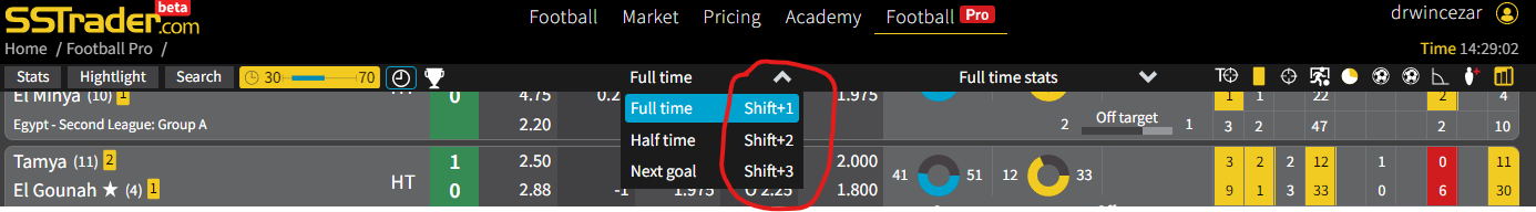 En esta función, puedes elegir qué coeficientes ver en el panel. Las opciones incluyen las cuotas del primer tiempo, las cuotas del tiempo completo y el próximo gol. Para ayudarte a comerciar de manera rápida y eficiente, también hemos incluido atajos de teclado que te permiten ver la información al instante sin esperar.&#x20;