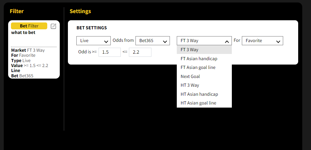 Questo filtro ti consente di simulare una scommessa e tenere traccia delle prestazioni del tuo modello se dovessi piazzare una scommessa quando si attiva. Le opzioni per questo filtro sono simili a quelle del filtro Quote.